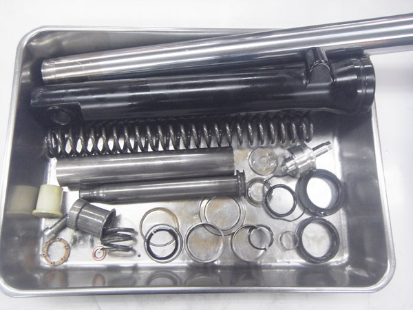 こちらの画像はノーマルのフロントフォークを分解したものです。フリーピストン構造なのでとてもシンプルなパーツ展開です。