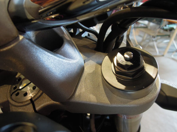 フロントフォークに調整機構のないMonster696ですが、スクーデリアオクムラのMEインナーキットを組み込むことで、伸び側ダンピングとスプリングイニシャル(プリロード)の調整が可能となります。ダンピング特性をガラリと変更したスクーデリアオクムラオリジナルのダンパーカートリッジを組み込み、MEスーパースポーツスプリングと併せてセットアップしました。
