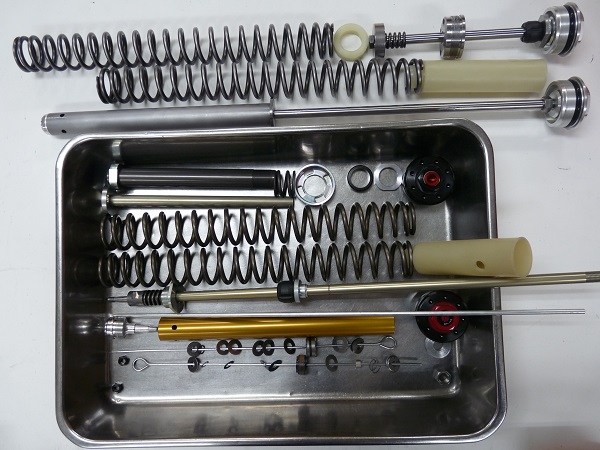 上の2本がノーマルフロントフォークから外したノーマルパーツ。パーツトレイの中、ブラック/レッドのフォークキャップ、ゴールド色のダンパーシリンダ、スプリング、ピストンなどがMEインナーカートリッジキットを構成するパーツです。