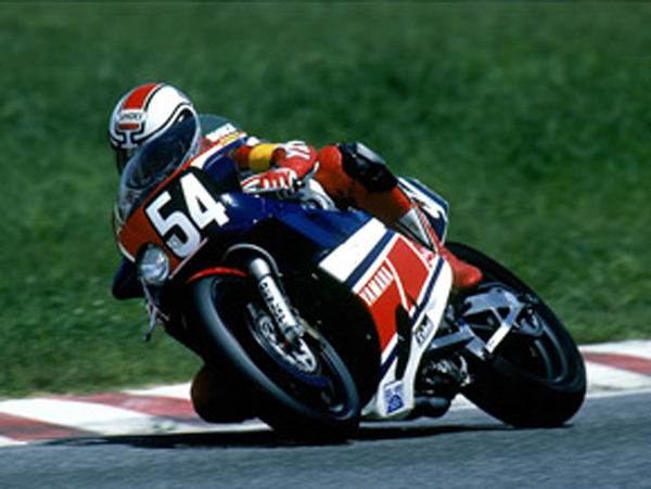 こちらはヤマハ初の4サイクルファクトリーマシン FJ750R。 シャケさんこと河崎裕之先輩と上野真一先輩が1984年の鈴鹿8耐にこのマシンを走らせました。終盤、マシントラブルに見舞われながらも5位に入賞。1984年は私が初めてヤマハに契約してもらった年で、このマシンはテストコースでよく見ていました。ここから始まったんですね、ヤマハの4サイクルテクノロジー。