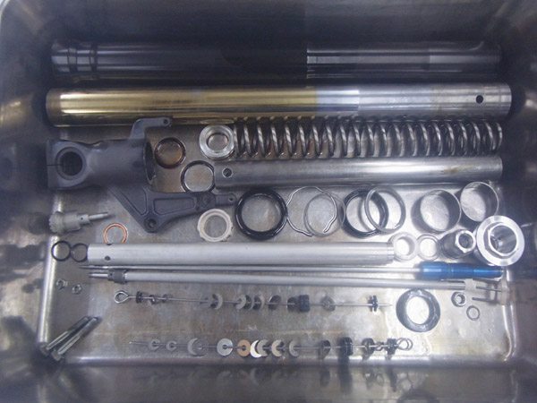 今回は前後サスペンションのフルメンテナンスとアウターパイプ、インナーパイプボトム、さらにトップブリッジへのMEアルマイトコーティング(ブラック)をご依頼いただきました。