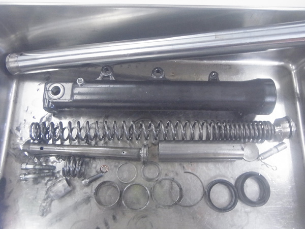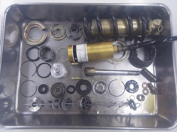 今回はフロントフォークのフルメンテナンス、リヤショックのMEダンピングチューニングをご依頼いただきました。フロントフォークアウターパイプのフェンダーステー部分が折れてしまっており、パーツが入手できないとのことから溶接で修復いたしました。