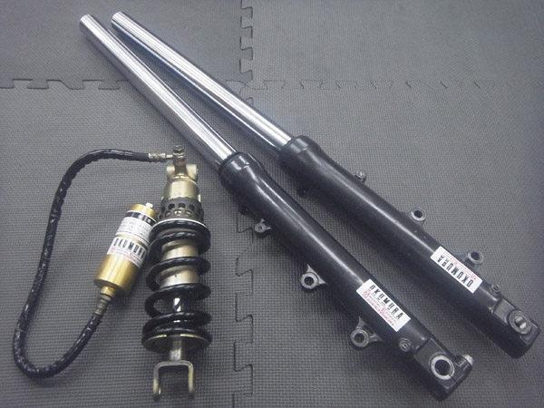 SOQI製インナーパイプ径Φ38正立フロントフォークとSOQI製モノショックです。
