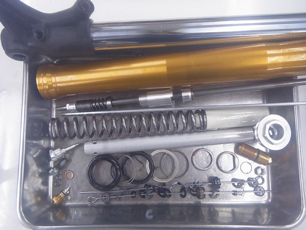 こちらのお客さまは事故に遭われてフロントフォークを損傷。その修復に中古パーツを使われたのですが、どうも調子が良くないということで、フルメンテナンスをご依頼いただいて、全てのパーツを再チェックすることにしました。