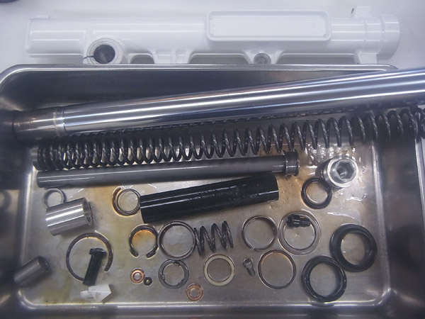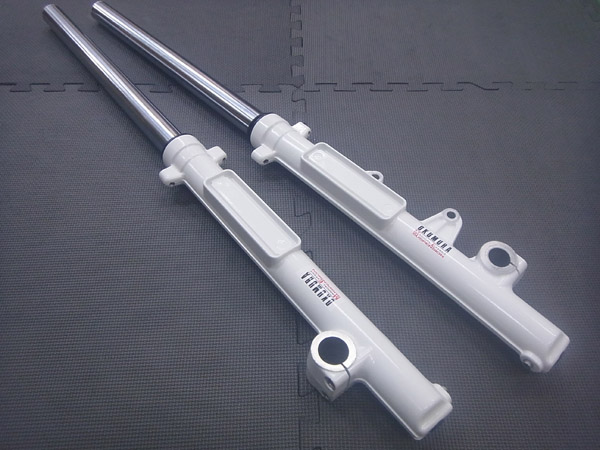 今回はフロントフォークのフルメンテナンスと併せて、アウターパイプへのパウダーコーティング(粉体塗装・ホワイト)をご依頼いただきました。