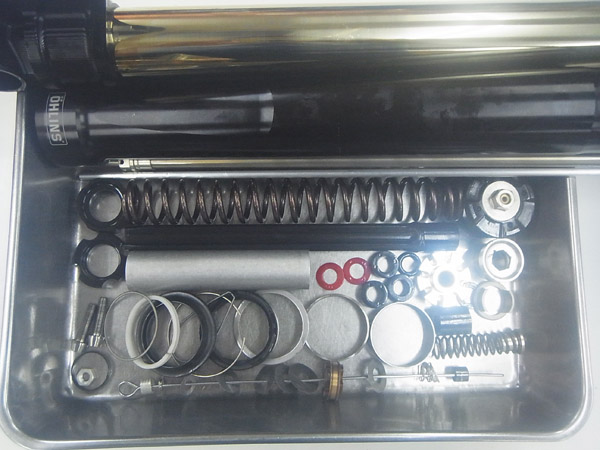 今回はフロントフォークのフルメンテナンスをご依頼いただきました。インナーパイプ径Φ48の新しいOHLINS製フロントフォークとなります。