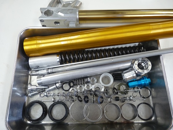 今回は純正採用のOHLINSフロントフォークのフルメンテナンスをお任せいただきました。