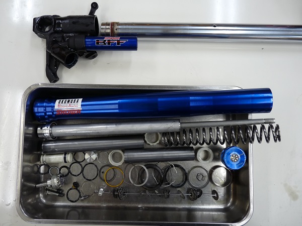 サスペンションメーカーのSHOWAがロードレースで得た技術を市販車にフィードバックさせたSHOWA BFF(Balance Free Frontfork)フロントフォークです。「バランスフリー」と呼ばれるBFFは、シリンダー内のピストンにダンピングフォースを発生しない構造を採用し、フロントフォークのシリンダー外側、アクスルホルダーにダンピングを生み出すシステムを配置、さらに加圧することでダンピングの応答性向上を果たしています。ダンピングの発生にタイムラグが少なくレスポンスが良くなったことで、安定したサスペンションの動きを得られるようになっています。スクーデリアオクムラではすでのこのBFFフロントフォークのフルメンテナンス、MEダンピングチューニングを施工しており、今回はすでにMEダンピングチューニングによってセットアップを施したフロントフォークのフルメンテナンスをご依頼いただきました。最新の技術をなるべく早く習得してお客さまのご要望にお応えできるようにしています。