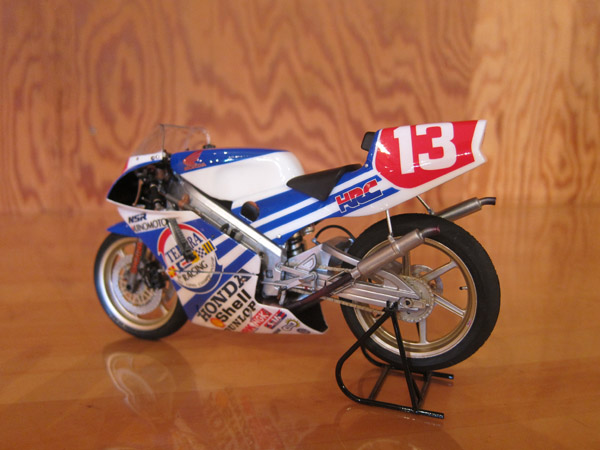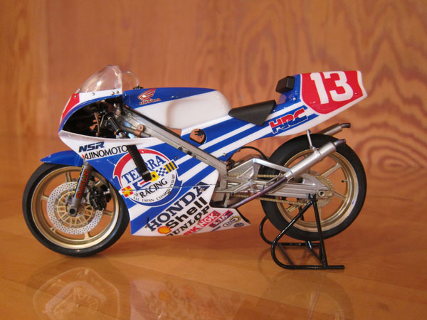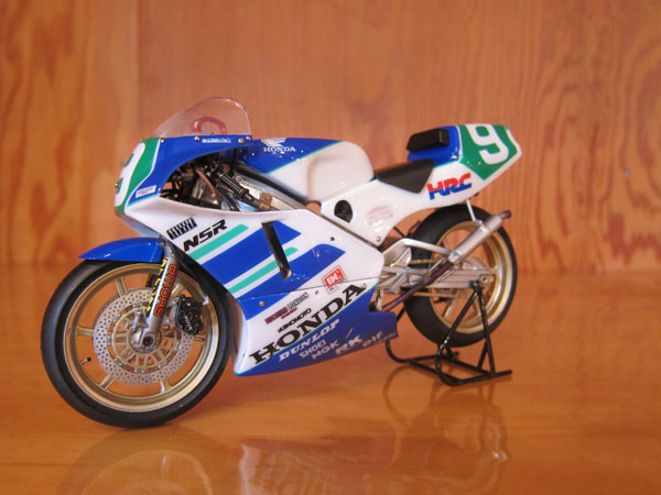 タミヤ模型から発売されている1/12 NSR250をベースに、元スクーデリアオクムラのスタッフ深谷佳孝さんが製作して、プレゼントしてくれた2台です。
