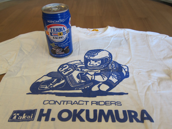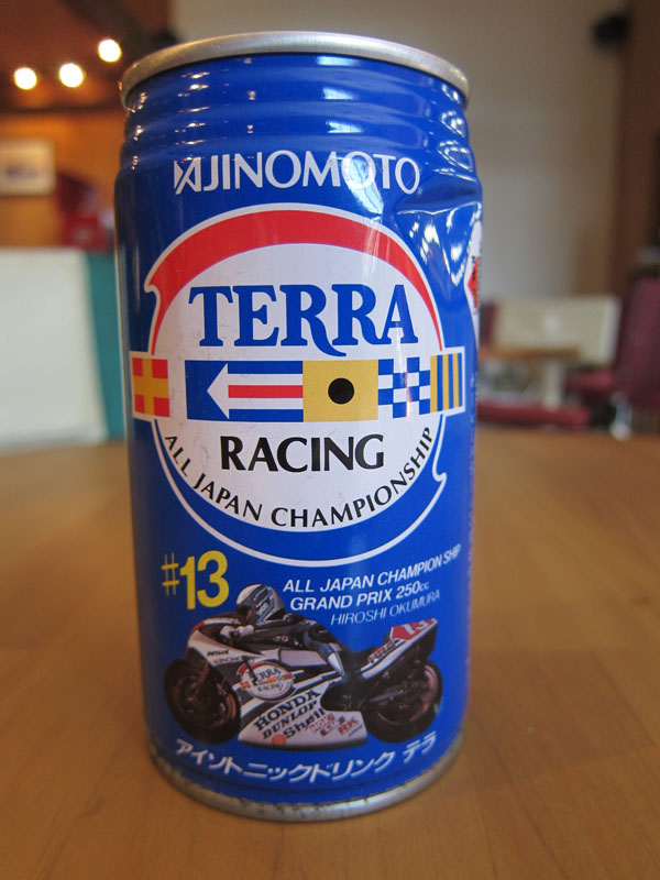 そして青い缶ですが、HRCに移籍して2年目の1989年、アジノモトホンダレーシングで走らせていただいた時に、味の素さんがスポーツドリンク「TERRA」のライダーバージョンを作っていただいたものです。