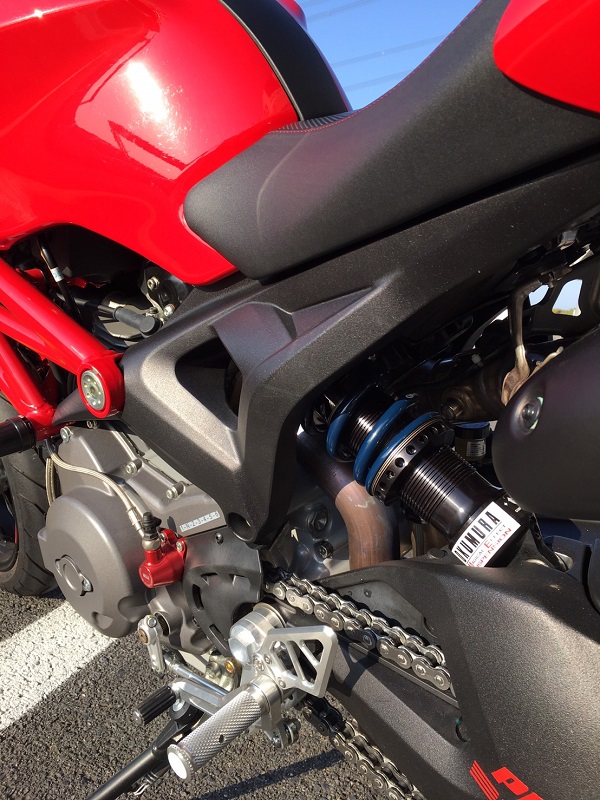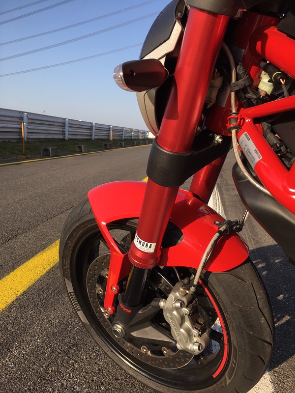 DUCATI Monster796はフロントフォークにスクーデリアオクムラオリジナルの「MEインナーカートリッジキット」を組み込み、リヤショックにはPENSKE RACING SHOCKSのニューモデル「8975」を装着しています。