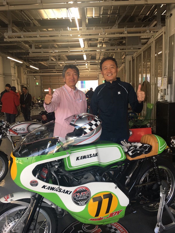 「MOTORCYCLE HERITAGE」 1972年までに製造されたレーシングマシンによるエキシビションレースで見事に優勝されたオーヴァーレーシング会長の佐藤健正さんとカワサキHSR。
