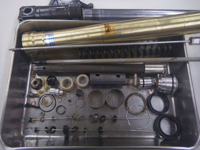 サスペンションの分解画像をご覧の通り、このマシンのサスペンションは長期間に渡ってノーメンテナンスだったようで、前後共にサスペンション内部はかなり汚れており、オイルの性能は大幅に劣化し、スラッジも堆積していました。また、インナーパイプは錆が深く進行しておりましたので、再メッキ加工によって再生しました。サスペンション以外にもステムベアリングの交換やリヤショックブレーキディスクの交換もご依頼いただきました。