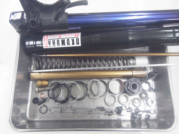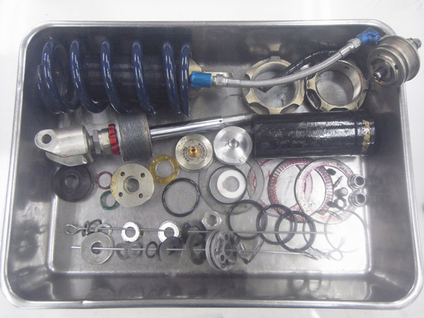 フロントフォークはMEダンピングチューニングはもちろんのこと、インナーパイプにMEチタンコートチューニング、アウターパイプにMEブラックカシマコーティングを施し、さらに作動フリクションの低減のためにダンパーシリンダー、ダンパーロッドに至るまでMEカシマコーティングを施したスペシャル仕様です。また、各パーツにコーティングを施すことで、アルミニウムパーツの地肌が擦れ合うことがありませんから、サスペンションオイルの汚れやスラッジが少ないのもメリットになります。このマシンをお譲りしてからずいぶん年月が経っていましたが、サスペンション内部の汚れが比較的少なかったのはコーティングの効果ですね。