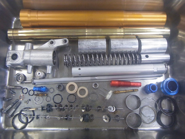 車体への装着に関しましてはお客さまが行なうとのことでしたので、NSR250Rに合わせたダンピングの仕様変更と0.75kgf/mmのMEスーパースポーツスプリングでのセットアップ。加えてインナーパイプのMEチタンコーティング(ゴールド)、アウターパイプ(ゴールド)とフォークキャップなどのパーツ(ブルー&レッド)のMEアルマイトコーティングを施しました。