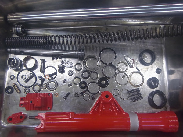 今回はフロントフォークのフルメンテナンスをご依頼いただきました。併せてアウターパイプのパウダーコーティング(粉体塗装)もご依頼いただきました。