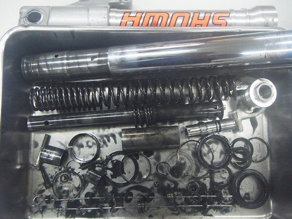 こちらのお客さまはホーネット250をとても大切に乗り続けられており、NSR250RのインナーパイプとCB400SFのアウターパイプを組み合わせてモディファイしたフロントフォークをホーネット250に組み込まれていました。もちろん、そのままではホーネットにフィットしていませんので、今回、MEダンピングチューニングとMEスーパースポーツスプリングによって、ホーネットに合ったフロントフォーク仕様にセットアップいたしました。