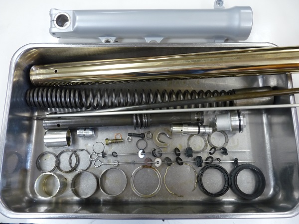 今回はフロントフォークフルメンテナンスと併せて、インナーパイプにゴールド色のMEチタンコーティングを施し、腐食によって痛んでしまったアウターパイプの表面をサンドブラストによって整えた上で、シルバーのパウダーコーティング(粉体塗装)を施しました。