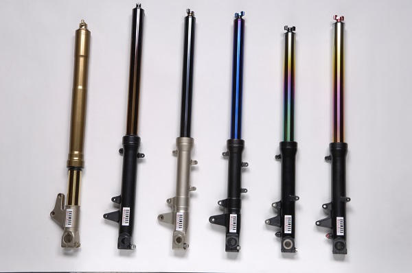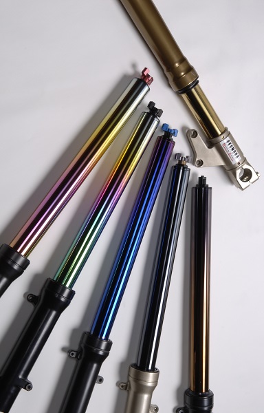 スクーデリアオクムラのインナーパイプMEチタンコーティングは、フロントフォーク・インナーパイプの性能向上に最も適した手法によるイオンプレーティング方式です。このコーティングを施すことで、パイプ表面のなめらかさを表す面租度が高まり、フロントフォーク・インナーパイプの表面と擦れ合うアウターパイプ側のガイドブッシュとのフリクションの軽減に大きく貢献します。