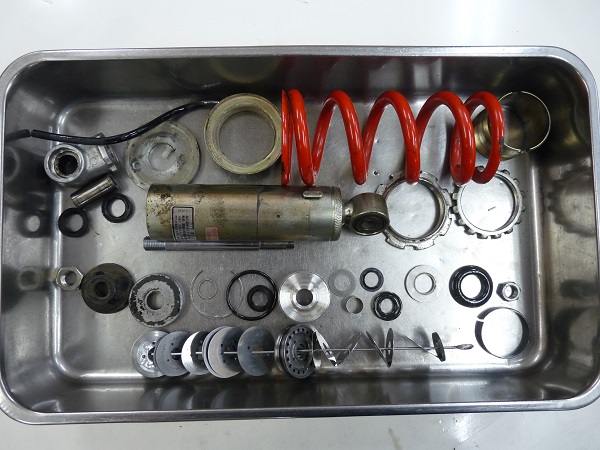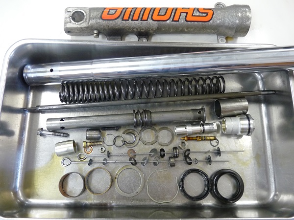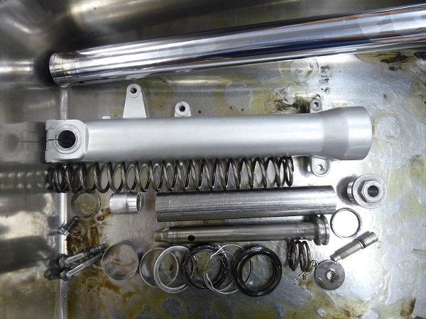現存する当時のレーサーレプリカモデルは希少かつ高価なものとなり、所有しているオーナーの方はコンディションを保つために廃盤となってしまったパーツの確保にたいへんだとお聞きしています。そのような状況からガレージに大切に保管されていることが多く、フロントフォークのインナーパイプや、リヤショックのダンパーロッドに錆が発生してるケースが珍しくありません。今回ご依頼いただいた2台のフロントフォークもインナーパイプの錆が深く進行しており、新しいパーツは入手ができませんので、再メッキ加工によって再生した上でフルメンテナンスを施しました。
