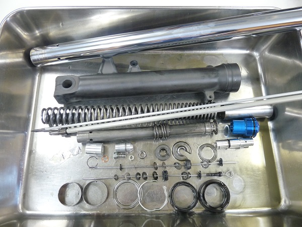 今回は傷で痛んでしまったフロントフォークインナーパイプの再メッキ加工と、アウターパイプMEブラックカシマコーティングを併せて施工しています。