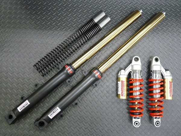 SHOWA製インナーパイプ径φ45正立フロントフォークと、SHOWA製ツインリヤショックです。