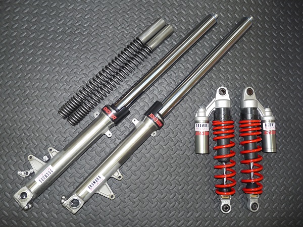 SHOWA製インナーパイプ径φ43正立フロントフォークと、SHOWA製ツインリヤショックです。