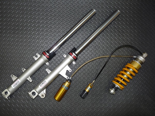 SHOWA製インナーパイプ径φ43正立フロントフォークと、OHLINS製モノリヤショックです。