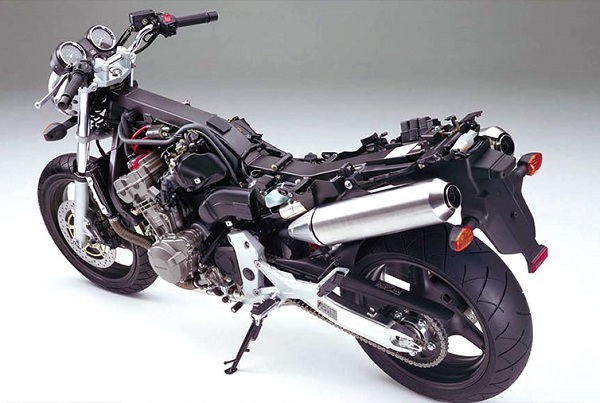 1996年に発売されたホーネット250、1998年に発売されたホーネット600に続く、ホンダの4気筒エンジン搭載ネイキッドロードスポーツのトップモデルです。CBR900Rに搭載された水冷4気筒DOHC4バルブ900ccエンジンをベースに、CVキャブレターから最新技術のPGM-FIに変更、エンジン仕様にも手を加えて、低中速で扱いやすくストリートやワインディング、ツーリングでスムースに走らせることのできるよう仕上がっています。ホーネット600のフレームを基本としながらも板厚を変更するなどして排気量に見合った剛性を出しています。