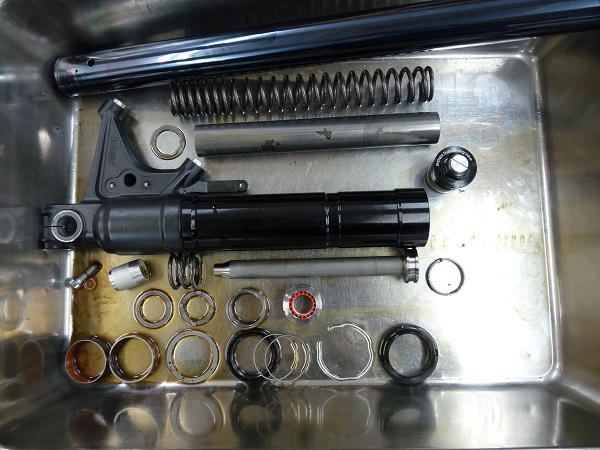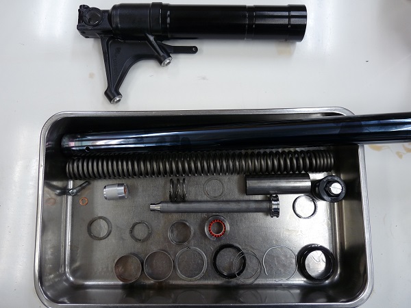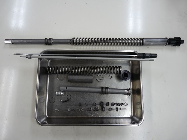 そして、こちらがCB1100RSノーマルフロントフォークの内部パーツ全てです。とてもシンプルなことが見て取れます。RS専用だと思いますが、フォークキャップはスプリングイニシャルの調整ができるようになっています。このパーツは不要となります。
