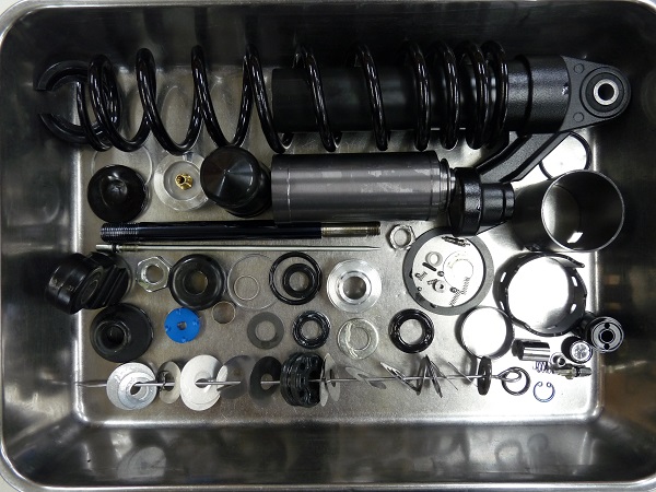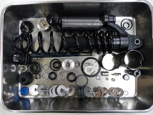 こちらが「MEインナーキット」のパーツ全容です。写真上のパーツが半完成状態のMEインナーキット。スーパースポーツモデルと同じ構造です。このままフロントフォークの内部にインストールします。