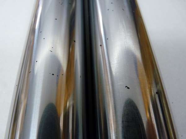 レース参戦を目的とするホモロゲーションモデルとして、レギュレーションをクリアするために300台のみが限定生産、販売されました。当時の価格は250万円を越えており、完全にレース参戦のみを考えてのモデルであったことが伺えます。ところがこのモデルが完成して間もなくレースのレギュレーションが、1,000ccから750ccに変更となり、活躍のステージがほとんどないまま一線級から退くことになりました。カムギアトレーンのV型4気筒、1,000ccエンジンを搭載した35年も前の貴重なマシンを、現在に至って所有されているお客さまよりフロントフォークのフルメンテナンスをお任せいただきました。曲がりと錆のあったインナーパイプを修正加工、再メッキ加工によって再生して完全な状態に仕上げてお納めいたしました。