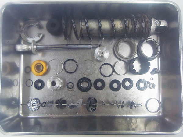 今回はOHLINSリヤショックのフルメンテナンスをご依頼いただきいました。残念ながらノーマルのリヤショックは非分解の構造のため、メンテナンスを施すことが出来ませんが、W650に装着可能なリ・プレイスサスペンションは、ほとんどがスクーデリアオクムラでフルメンテナンスが可能です。このようなカテゴリーのバイクでもサスペンションメンテナンスの効果は大きく、乗り心地、疲労感が全く違います。お試し下さい。