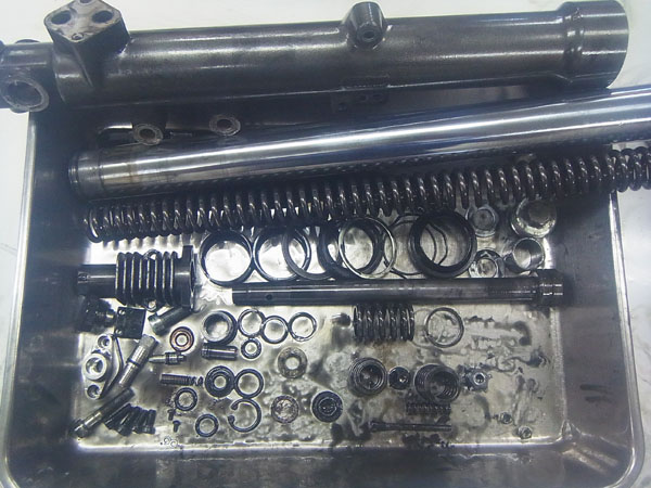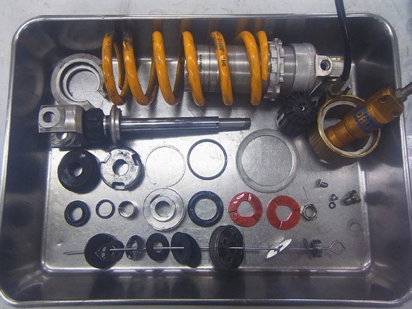 今回は純正フロントフォークとOHLINSリヤショックのフルメンテナンスをご依頼をいただきました。
