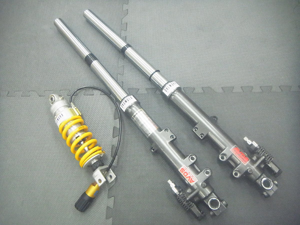 KYB製インナーパイプ径Φ38正立フロントフォークとOHLINSモノショックです。