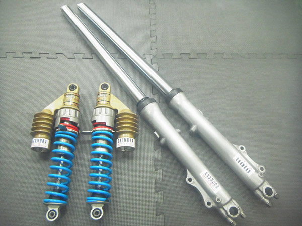 KYB製インナーパイプ径Φ38正立フロントフォークとワークスパフォーマンス製リヤショックです。