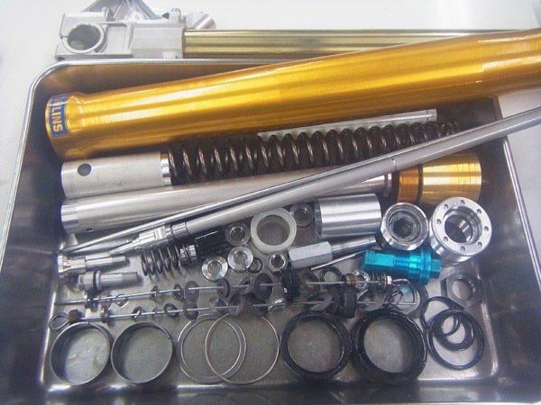 今回はOHLINS製倒立フロントフォークのフルメンテナンスをご依頼いただきました。