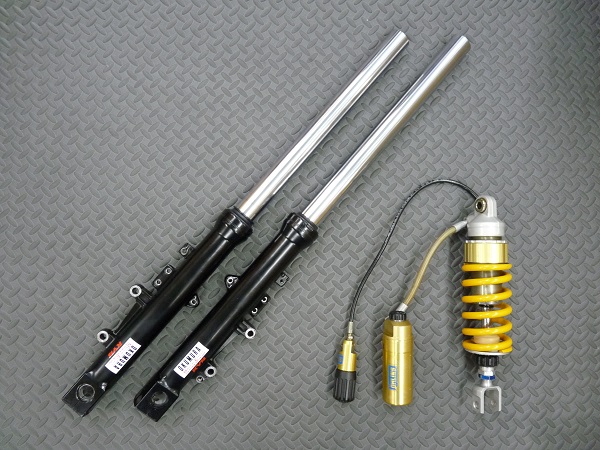 KYB製インナーパイプ径φ41正立フロントフォークとOHLINS製リヤモノショックです。