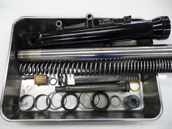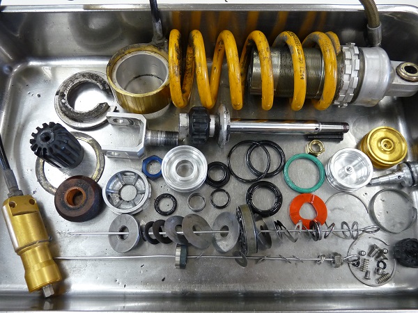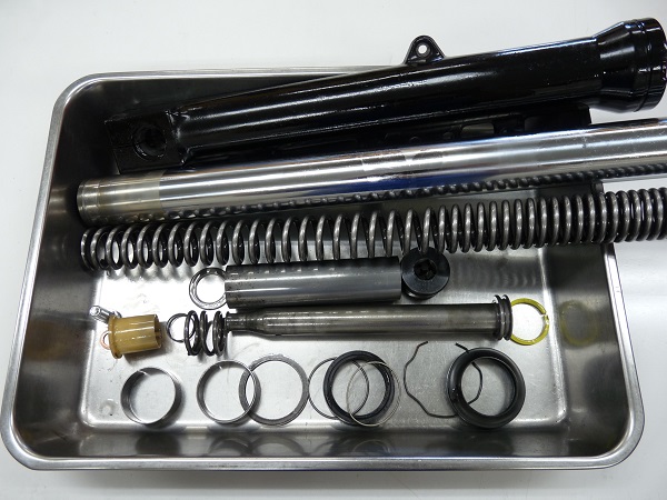 今回はノーマルのフロントフォークとOHLINSリヤショックのフルメンテナンスをご依頼いただきました。名車を永く乗り続けるためにサスペンションのメンテナンスは重要です。