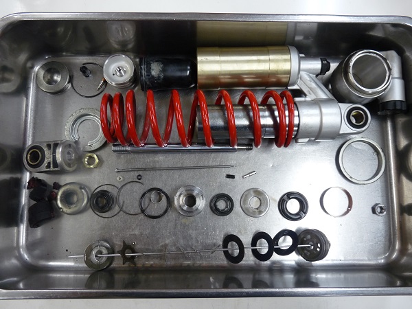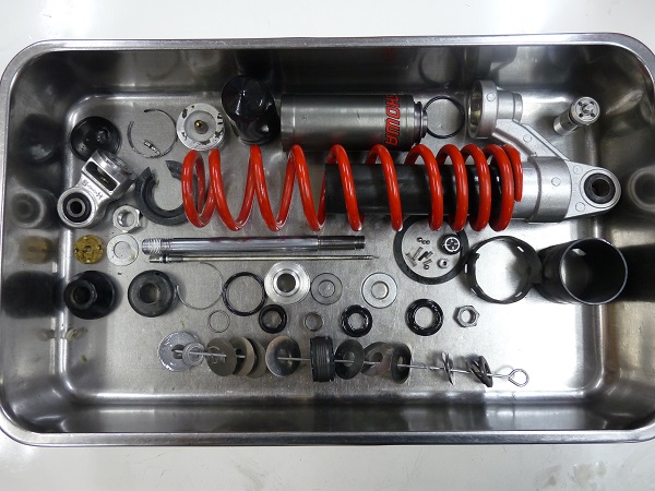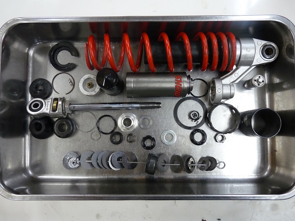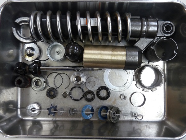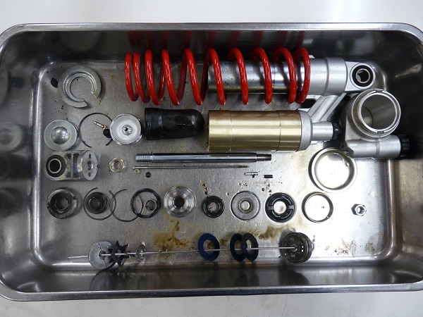 SHOWA製ツインショックのフルメンテナンスは、税込みで¥38,016-、KYB製ツインショックは¥40,392-。いずれも左右ペア、基本交換パーツ、サスペンションオイル、パーツ超音波洗浄、計測、研磨作業を含んだ金額です。全て純正、正規のパーツを使います。
