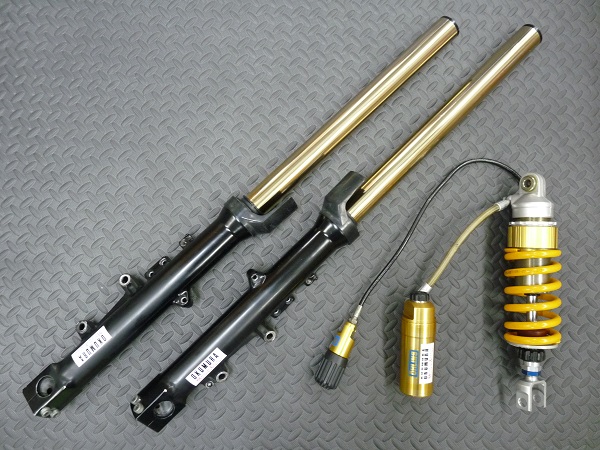 KYB製インナーパイプ径φ41正立フロントフォークと、OHLINS製モノリヤショックです。