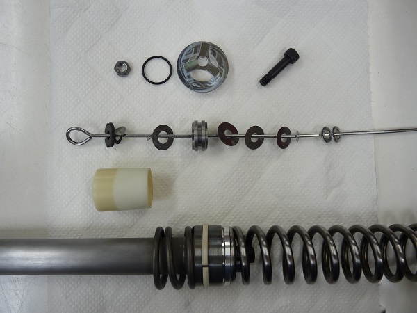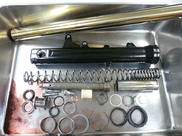 昨年にOHLINSリヤショックのフルメンテナンスを施した車両を中古にご購入されたお客さまより、フロントフォークのアップグレードについてご相談いただき、MEダンピングチューニング(コントロールバルブ組み込み)+0.80kgf/mのMEスーパースポーツスプリングでのセットアップをお勧めし、さらにお客さまのご希望でインナーパイプにゴールドのMEチタンコーティングとアウターパイプには半艶ブラックのパウダーコーティングで機能性の向上とルックスも併せてアップグレードしました。OHLINSのリヤショックは昨年末にフルメンテナンスを施していますので、これで前後サスペンションがバランス良くセットアップが整いました。