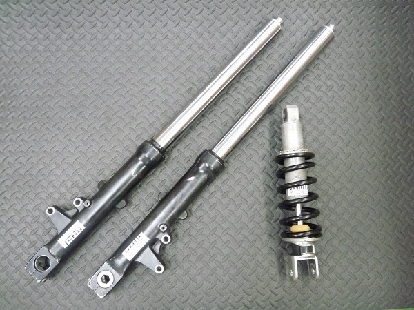 KYB製インナーパイプ径ファう43正立フロントフォークと、KYB製モノリヤショックです。
