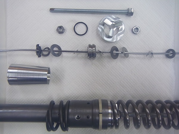 こちらが「コントロールバルブ」を構成するパーツです。専用のホルダーに積層式のピストン+バルブシムを組み込んで、サスペンションオイルの流路をコントロールします。オイルロックピースのテーパー角に加工を加えて、有効ストロークを多く使えるようにチューニングしています。「フリーピストンタイプ」のフロントフォークをアップグレードするための、スクーデリアオクムラオリジナルサスペンションチューニングです。