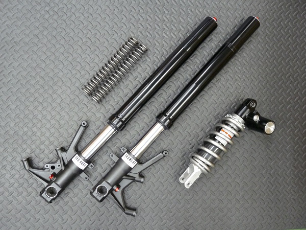 KYB製インナーパイプ径φ43倒立フロントフォークと、KYB製モノリヤショックです。ZX-14Rは2012年に発売されました。先代のZZR1400から低速から高速域まで全域でエンジンパワーを上げており、メガスポーツの目指すところの「速さ」を追求しながらも、フレーム剛性の見直し、各パーツの軽量化、サスペンションの仕様変更、スイングアームを10mm延長してフロント荷重を高めることで、速さだけに留まらず軽快なハンドリングを狙っています。さらに3モードのトラクションコントロール、スリッパークラッチによって扱い易さも高めています。このZX14Rをワインディングやツーリングでより気持ち良く走らせたいというご希望で、前後サスペンションのMEダンピングチューニングをご依頼いただきました。ノーマルのフロントフォークスプリングは設定値が高く、ワンランク低い設定の1.00kgf/mのMEスーパースポーツスプリングを組み込んでセットアップいたしました。