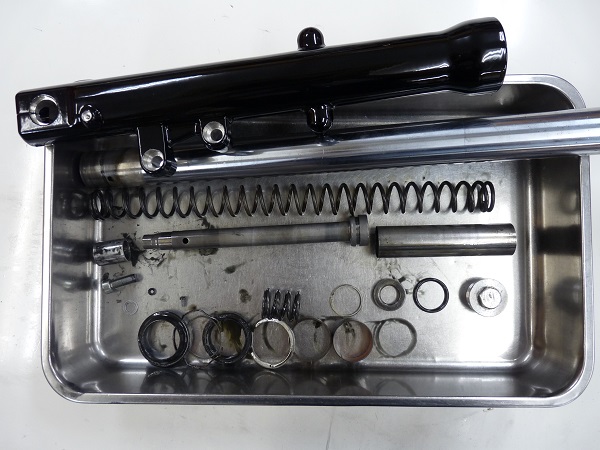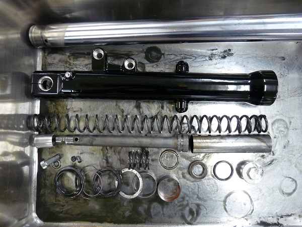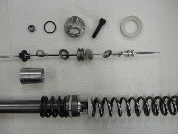 ノーマルのフリーピストンタイプのフロントフォークの内部に、スクーデリアオクムラオリジナルの「コントロールバルブ」を組み込んで、サスペンションオイルの流路をコントロールすることでダンピング特性を変えています。ノーマルフロントフォークのダンピング(減衰)感が希薄で接地感に乏しく、ギャップ通過時の突き上げ感が気になる状態から、このチューニング手法によってギャップ吸収性が高く、接地感を感じられるフロントフォークにアップグレードすることができます。