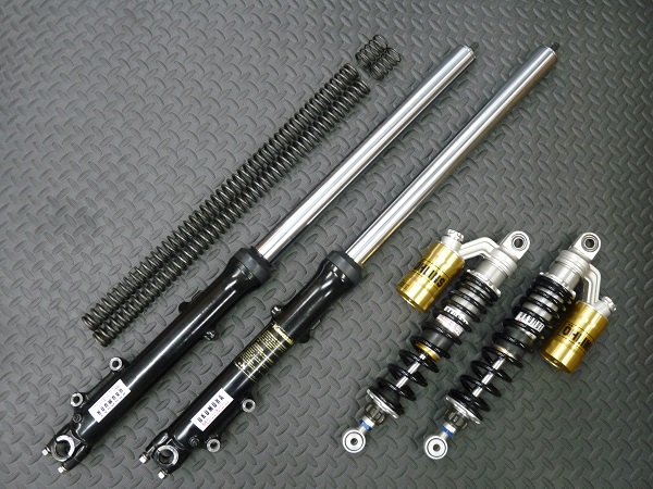 KYB製インナーパイプ径Φ38正立フロントフォークと、OHLINS製ツインリヤショックです。