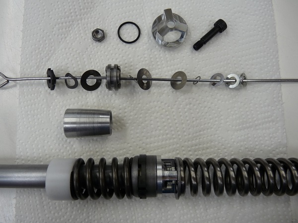 こちらがスクーデリアオクムラオリジナルの「コントロールバルブ」の構成パーツです。「フリーピストンタイプ」のフロントフォークのダンピング特性を高めるためにノーマルのシリンダーとスプリングの間に積層式のバルブを組み込むことで、サスペンションオイルの流れをコントロールして、ギャップ吸収性を高めることで、接地感がつかみやすく、質感の高いサスペンションに仕上げることができます。オイルロックピースのテーパー角を変更することで、実有効ストロークを増やす工夫もしています。