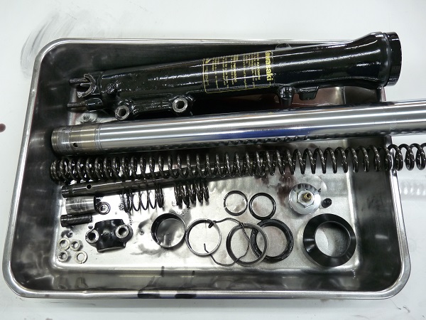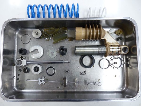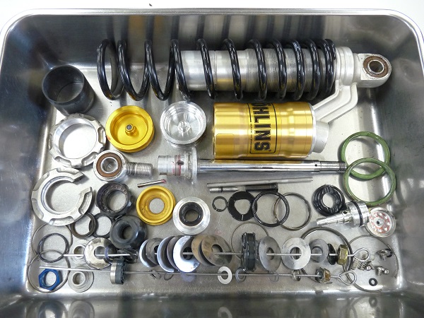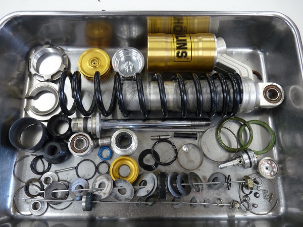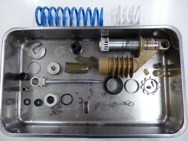 こちらは別のお客さまから、Z1000J用ワークスパフォーマンスリヤショックのフルメンテナンスをご依頼です。このショックユニットは11年前にフルメンテナンスを施しており2度目の施工になりますが、今回はフルメンテナンスの作業に加えて、ブラダの交換やマウントブッシュの交換、スプリングの粉体塗装(パウダーコティング)など、レストア的な作業を併せて行いました。