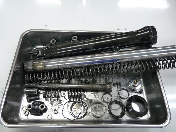 KZ1000R2フロントフォークのMEダンピングチューニングによるセットアップ、リヤショックのフルメンテナンスが完了いたしました。